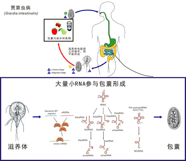 研究發現,來自四個不同分化時期的賈第蟲小RNA主要由內源siRNA和tRNA衍生的小RNA組成。內源性siRNA幾乎全部來自賈第蟲基因組中有轉座活性的端粒轉座子和三個新定義的內源性siRNA 產生區,這些siRNA可以反式作用方式抑制賈第蟲表面抗原等基因的表達,并參與了該鞭毛蟲從滋養體向孢囊分化的調控過程。內源性小干擾RNA并不是唯一能調控賈第蟲分化的小RNA,因為大量tRNA來源的小RNA在賈第蟲分化過程中的表達變化比內源性小干擾RNA還明顯。經過深入的比較分析,該研究在賈第蟲中鑒定出五種新的tRNA來源的小RNA,其中四種的產生可能跟他們之前報道的sitRNA有密切關系。雖然賈第蟲是最簡單原始的真核生物,但它卻擁有復雜的小RNA調控系統。令人驚奇的是,在賈第蟲中并沒有發現典型的microRNA,而許多過去報道的賈第蟲microRNA被鑒定為內源siRNA的一部分。