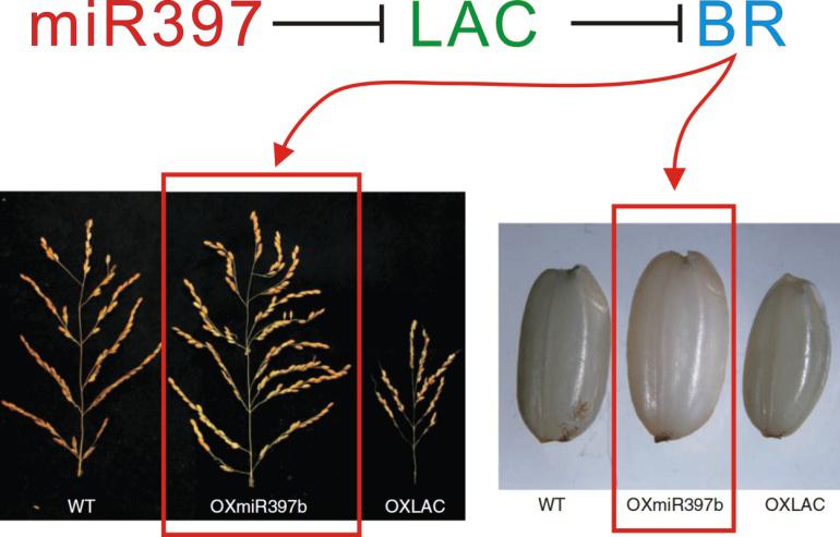 該研究另一重要發現是揭示了水稻內源一條重要通路,即miR397是通過下調其靶基因OsLAC的表達而發揮作用的。OsLAC基因編碼一種漆酶類蛋白,而該類蛋白被普遍認為與木質素代謝相關,還未見其與水稻籽粒發育等產量相關性狀關系的報道。陳月琴教授課題組成員首次證明了miR397介導的OsLAC mRNA的降解參與調控水稻植株對油菜素內酯的敏感性,并最終影響了產量相關性狀。該研究揭示了漆酶家族成員的又一重要功能。
