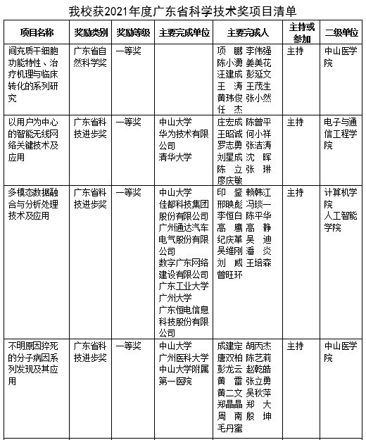 中大新聞網廣州4月15日電(通訊員廖思媚)2021年度廣東省科學技術獎獲獎項目今天在廣東省科技創新大會公布,我校共獲得25項獎勵。其中,以第一完成單位獲獎17項,包括一等獎7項、二等獎10項;作為參加單位獲獎8項。獲獎總數、一等獎、二等獎獲獎數均列各申報單位之首。
