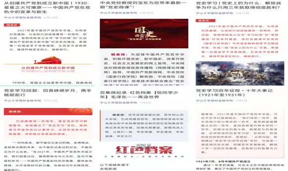 國際金融學院充分利用學院微信公眾號和學院網站等平臺開展黨史學習教育。開設“黨史學習”專欄,發布“黨史學習心得”系列18 篇;“從創建共產黨到成立新中國”欄目系列8篇;“黨史上的為什么”系列8篇;“黨史微課”7篇;“百年征程”專欄10篇;“紅色檔案”系列11篇。