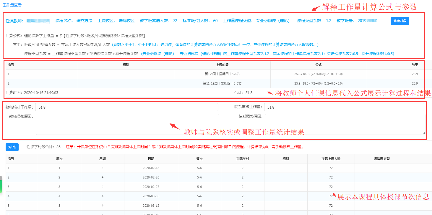 系統(tǒng)還人性化、全方位為教師展示教學(xué)工作量的整個計算過程。系統(tǒng)通過解釋計算公式與參數(shù),并將教師個人任課數(shù)據(jù)代入并展示計算過程,力求讓教師清晰了解系統(tǒng)工作量計算結(jié)論的因果關(guān)系,確保教師一目了然。