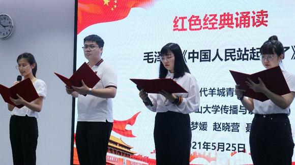 由“新時代羊城青年先鋒宣講團”代表、我校傳播與設計學院張夢媛、趙曉營、聶鑫、姚堯四位博士生帶來的紅色經典誦讀《中國人民站起來了》,聲情并茂、情緒高昂,生動再現了1949年9月21日毛澤東同志在中國人民政治協商會議第一屆全體會議上致開幕詞的重要歷史時刻。