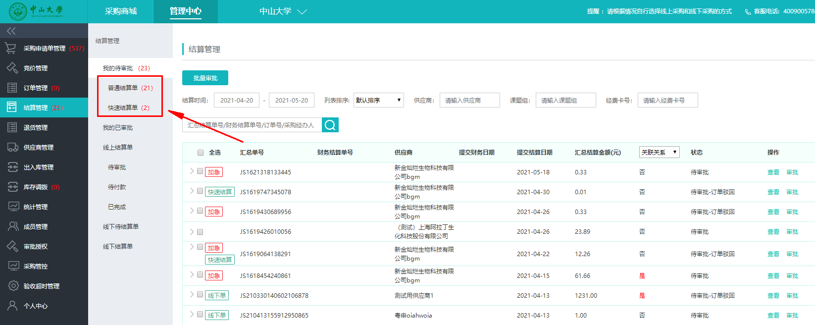 實驗材料采購平臺快速結(jié)算通道和普通結(jié)算通道(來源:設備與實驗室管理處)