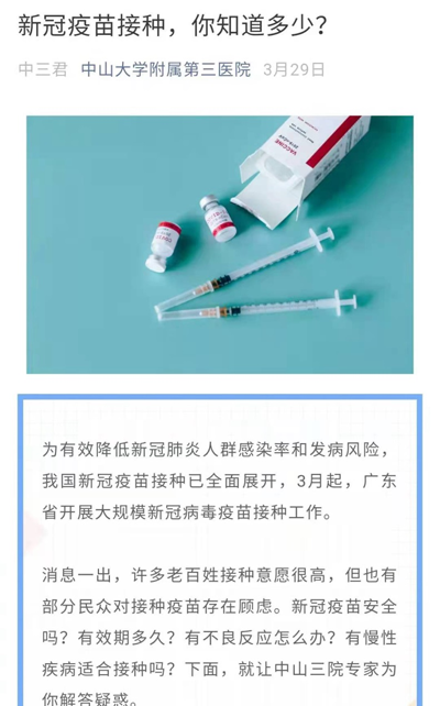 在微信公眾平臺科普新冠疫苗接種知識(來源:附屬第三醫院)
