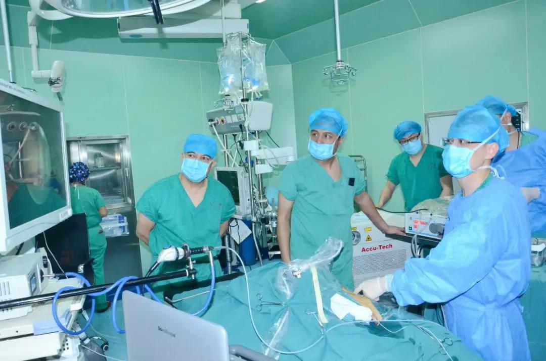 許可慰(右前)在喀地一院為結石寶寶進行公益手術(來源:孫逸仙紀念醫院)