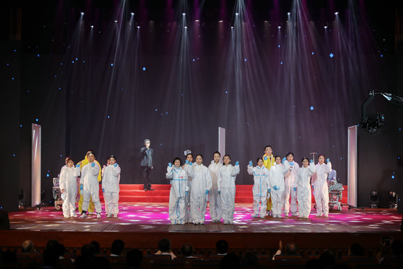 附屬第六醫(yī)院藝術(shù)團(tuán)、援鄂醫(yī)療隊(duì)全體隊(duì)員表演音樂情景劇《醫(yī)者》(來源:黨委宣傳部)