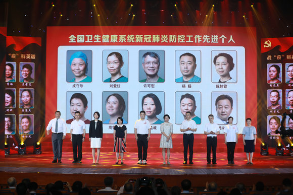 活動(dòng)現(xiàn)場向我校獲“全國衛(wèi)生健康系統(tǒng)新冠肺炎疫情防控工作先進(jìn)個(gè)人”稱號(hào)的10位同志致敬(來源:黨委宣傳部)