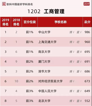 2019軟科中國最好學科排名中,我校工商管理學科位列第一(來源:管理學院)