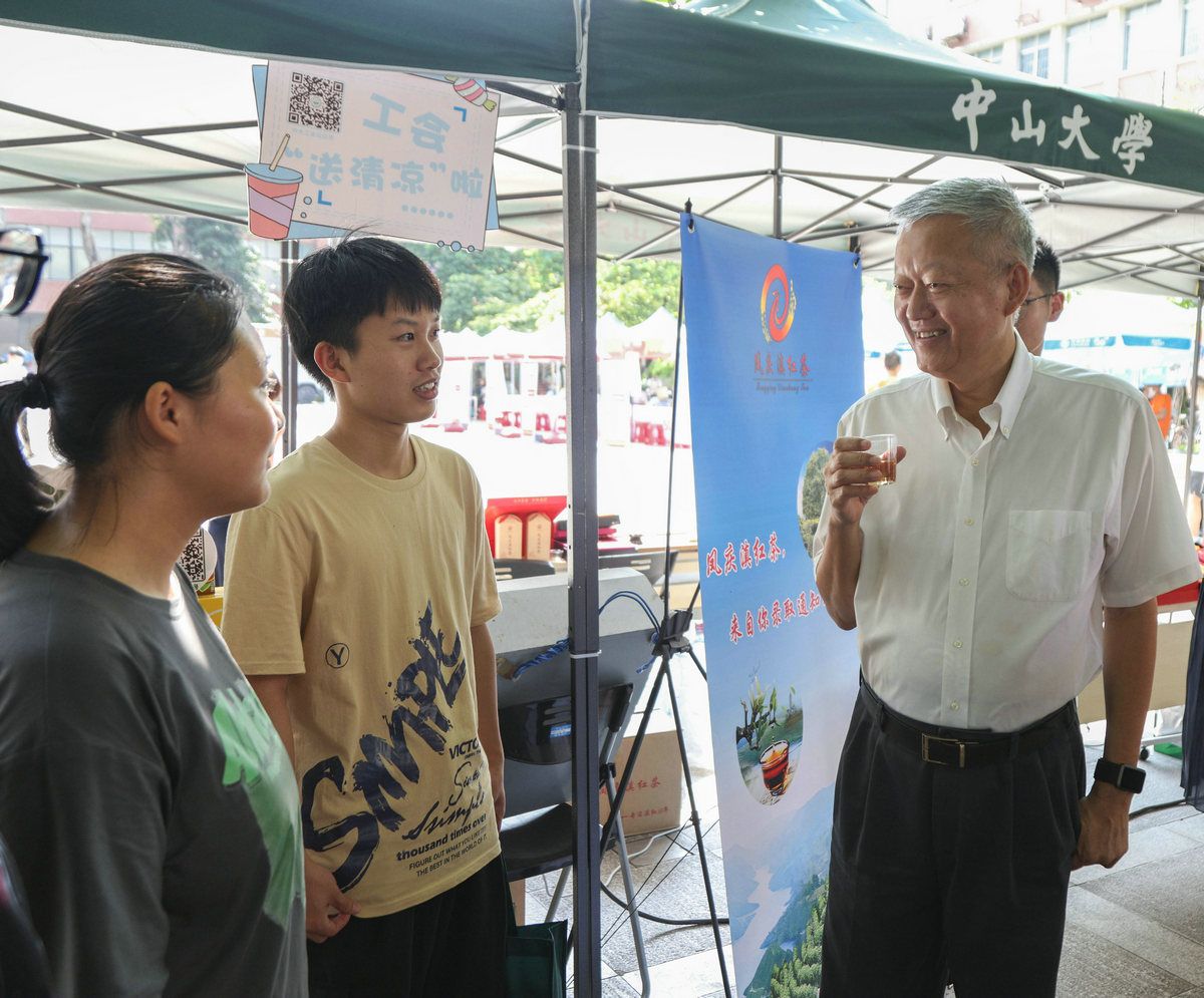 為加強對學生的愛國主義教育,使學生牢記“國之大者”,中山大學和鳳慶縣共同策劃了鳳慶縣優秀畢業生表彰活動,并聘請優秀畢業生作為鳳慶滇紅茶文化推廣志愿者,將鳳慶的茶葉和茶文化帶到學生所在的高校。中山大學作為鳳慶縣的幫扶高校,將鳳慶的茶葉放入本科錄取通知書里,使鳳慶茶葉伴隨著錄取通知書走到了全國各地,走進了千家萬戶。8月31日,為彌補家長學生將錄取通知書里的鳳慶茶珍藏而品嘗不到“滇紅味道”的遺憾, 3名新生作為鳳慶滇紅茶文化推廣志愿者在鳳慶縣掛職副縣長張哲的帶領下,在中山大學南校園親新廣場開展滇紅茶免費品嘗活動,將“錄取通知書里的味道”帶進了中大校園。活動得到了校領導的大力支持,陳春聲書記、高松校長、國亞萍副書記、余敏斌副書記、楊東華副校長來到活動現場看望學生,親切地與學生交流,并送上了入學禮包。學生們感到非常激動,由衷感謝學校對他們的關心關愛。