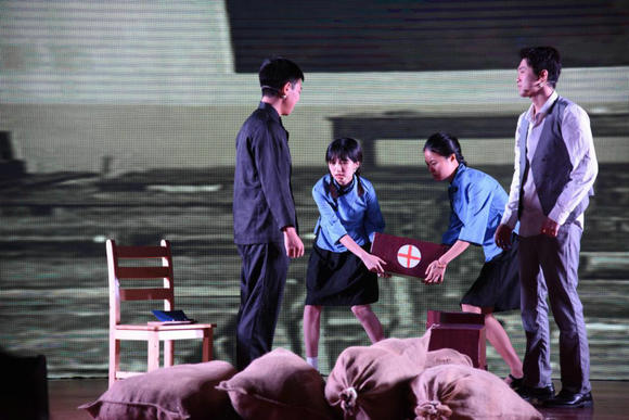 當日本侵華戰火在“影子戲”燃燒時,新生也加入了搶救性搬離教學書籍、器材的行列。在“救護團成員”的引導下,新生被帶入了“躲避炮火”的“戰壕”。“戰壕”里有三列草席,供同學們坐下觀看影片。這一幕以“影子戲”的戲劇形式呈現。1932年淞滬戰役爆發,從廣州一路北上的光華救護隊,經長途跋涉,以最快速度抵達上海前線,在槍林彈雨中拯救傷員,冒著失去生命的風險,在前線組成最堅定的醫療支援隊伍。