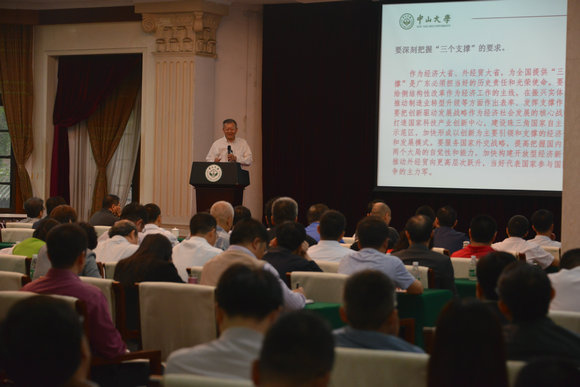 4月25日上午,我校在廣州校區南校園召開校院兩級黨委中心組專題學習會議,學習習近平總書記對廣東工作重要批示精神,校黨委書記陳春聲作輔導報告。各二級黨組織(黨總支)中心組成員,機關各部、處、室正職近280人參加會議。