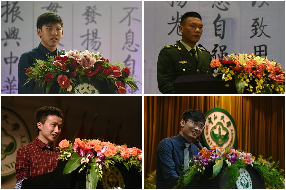 新生代表戴紫薇(左上)、楊靜(右上)、帕熱迪古麗·努爾艾合麥提(左下)、徐步舒(右下)分別發(fā)言