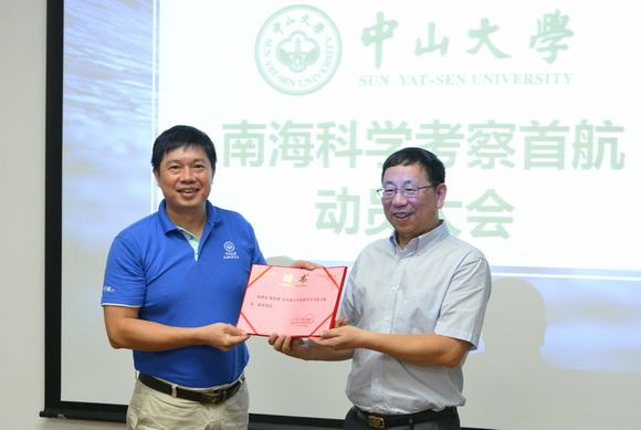 陳春聲書記為中山大學南海科學考察首航團隊授旗。殷克東教授、楊建林書記、黃龍舟主任代表首航科考隊員接旗。