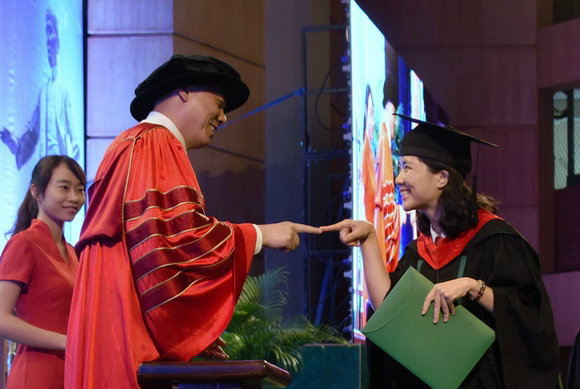 環境科學與工程學院本科畢業生冼婉姍走到校長面前,與校長來了一次食指碰食指的“E.T.式”手勢互動。“我想和校長做朋友。”冼婉姍解釋道,“在電影《E.T.》里,小男孩艾里奧特就是通過這種方式和外星人成功交流,最后做成了好朋友。