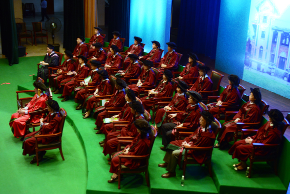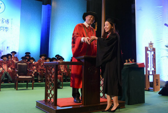 梁銶琚堂,洪亮的一聲“恭迎主禮教授!”之后,現場屏幕中,一道光束隨著殿堂大門徐徐開啟,主禮教授們在執權杖教授的引領下依次入場。執權杖教授款款走向舞臺,在司儀的引導下,將權杖慢慢放上權杖基座,此刻屏幕中,權杖熠熠生輝。如此富于“魔力”的出場,引起畢業生們驚呼一片。莊嚴國歌、諄諄訓詞,畢業學子一一上臺,接受“男神”校長贈送畢業紀念冊,并依次與校長握手。