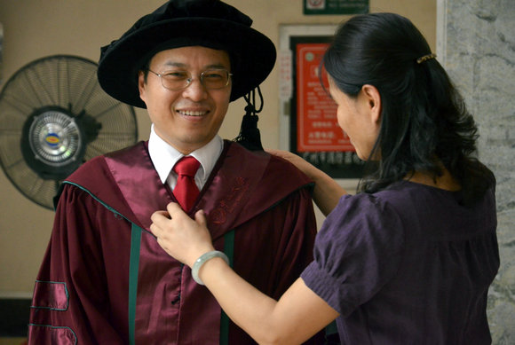 來自同一學院的博士畢業生曾衍瀚,拄著拐杖上臺,校長關切地詢問了情況。曾衍瀚笑著說:“得到校長的問候,很感動,覺得校長挺平易近人。”