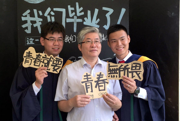 在校友會攤位旁,有一個類似攝影棚的留影區。一位頭發有些發白的中年人手舉“青春”字樣的紙牌,和兩位身著碩士服的畢業生對著鏡頭合影留念,兩位畢業生分別舉著“青春就要”、“無所謂”的紙牌。原來,這是校友會今年為畢業生設計的類似“拍立得”的免費留影區,并對留影背景做了特別設計,還有小胡須或寫有字的紙牌道具可供選擇。采訪得知,這位中年人是信息科學與計算學院的沈偉教授,旁邊兩位是他的學生彭韜和袁杰。“跟他們在一起,我感覺自己很青春!”沈偉笑著說。本科期間,彭韜和袁杰的論文指導老師都是沈偉教授,畢業后,兩人光榮參軍了;兩年后,又重新回到中山大學攻讀碩士學位,機緣巧合,導師仍是沈偉教授。“能跟沈老師學習是一輩子的幸福!”彭韜興奮地說。在一旁的袁杰補充道:“特別感謝沈老師的教導。”