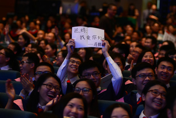 在嶺南學院畢業典禮開始之前,現場大屏幕出現了一位畢業生手舉著一張紙對著現場鏡頭的畫面,上面寫著:“爸媽,我愛你!馬錦豪”,全場頓時響起熱烈的掌聲。