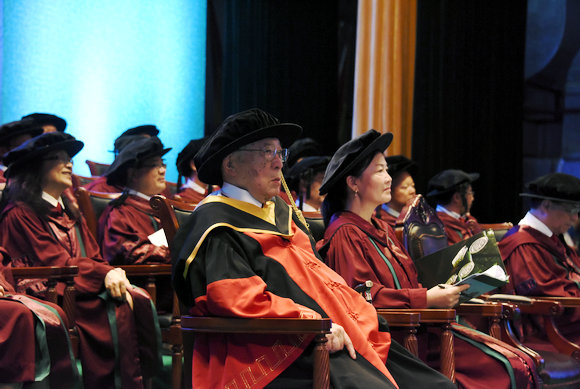 今年的畢業典禮主禮臺上,有一位特別的來賓。中山大學顧問董事會名譽主席、中山大學名譽博士、嶺南學院董事會名譽主席、香港美心集團名譽主席伍沾德先生,受羅俊校長邀請參加學校的畢業典禮。已經90多歲高齡的伍沾德先生,堅持坐在主禮教授席,見證嶺南學院每一位學子畢業的神圣時刻。