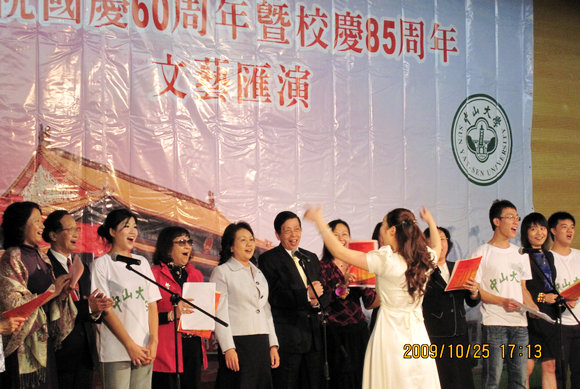80周年校慶晚會上,在中山大學藝術教育中心徐紅副教授的指導下,《山高水長》作為晚會壓軸的歌曲,由中大附屬小學學生、校園歌手、學生合唱團、教工合唱團、老教授合唱團的團員們共同演唱,感染了在場的眾多師生。