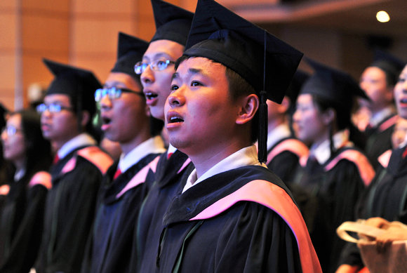 畢業典禮上,畢業生們起立齊唱中山大學校歌(攝影:郭中飛)