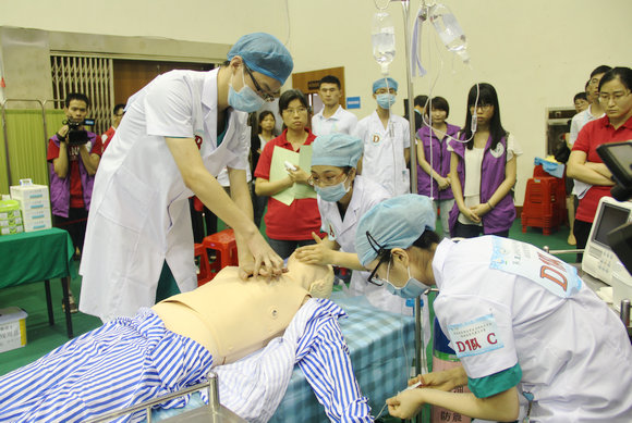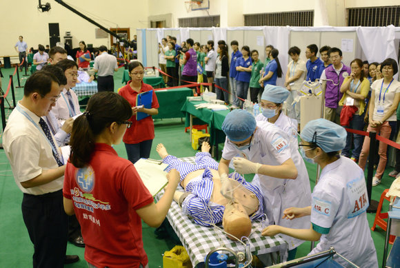 此外,還有幾十位教官參與了本屆賽事培訓,大部分“脫產”帶學;涉及某些專科問題,帶教老師認為有爭論的,還會請其他專家過來討論。此外,由于本屆賽事由中大主辦,另一批富有經驗的老師都被抽調去從事出題或賽事組織工作,參與培訓的教官多數(shù)是新手。競賽副總指揮、我校醫(yī)教處處長肖海鵬笑著說:“我們培訓學生的過程其實也是在考驗、培訓教官。”
