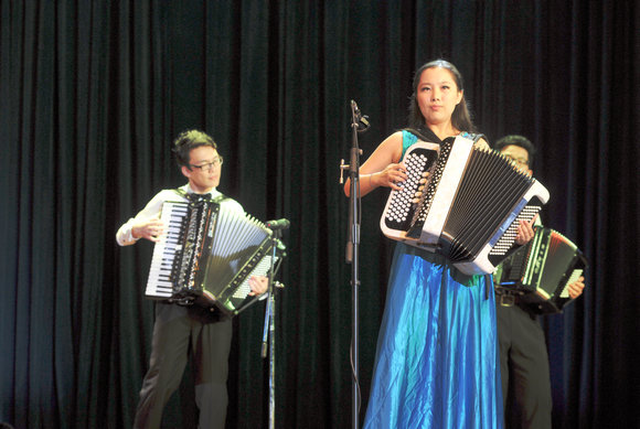 本次專場演出的另一主角,是組建至今僅五個(gè)月的中山大學(xué)巴揚(yáng)琴樂團(tuán)。這個(gè)九人樂團(tuán),用巴揚(yáng)琴這種尚不為人所熟知的樂器,演奏觀眾耳熟能詳?shù)慕?jīng)典曲目,第一次在師生面前精彩亮相。整場演出,樂團(tuán)奉獻(xiàn)了《寂靜的平原》、《愛美麗圓舞曲》、《彈起我心愛的土琵琶》、《只差一步》、《傣家歡慶潑水節(jié)》、《拉德斯基進(jìn)行曲》等六首曲目。他們希望通過悠揚(yáng)的旋律勾起觀眾們對過去的記憶,同時(shí)向這些經(jīng)典曲目致敬。