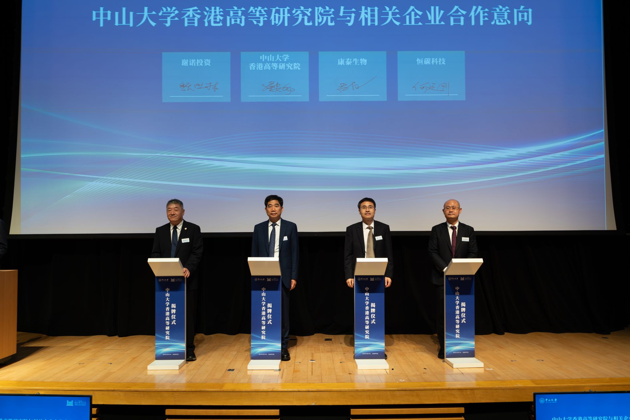中山大學香港高等研究院院長徐安龍、深圳康泰生物制品股份有限公司總裁苗向、廣東恒碳科技有限公司董事長何廷剛、廣州謝諾投資集團有限公司創始合伙人、投委會主席魏曉林作為代表共同簽署中山大學香港高等研究院與相關企業合作意向協議