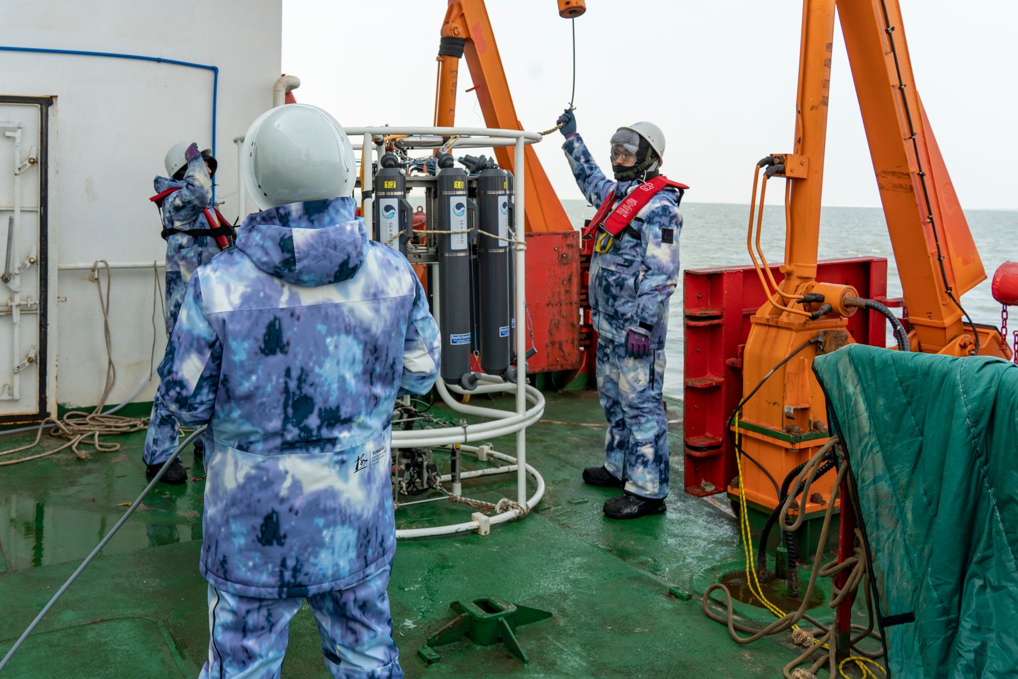 在渤海灣的30多個科考站位上,他們在冰冷的海面上忙碌著,展開了一場與時間賽跑的科學探索。他們測量溫度、鹽度,捕捉葉綠素a的微光,記錄濁度的變化,感知溶解氧的呼吸。為更深入地了解這片海域,他們還布放了兩個長期觀測潛標。
