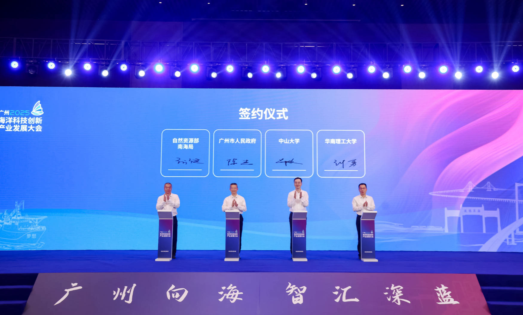 6日,廣州市舉辦首屆海洋科技創(chuàng)新發(fā)展大會,廣州市市長孫志洋、廣東省自然資源廳廳長胡建斌、自然資源部海洋戰(zhàn)略規(guī)劃與經濟司副司長馮磊致辭。本屆大會以“廣州向海,智匯深藍”為主題,設置了科技創(chuàng)新成果和產業(yè)產品展示區(qū)域,中山大學多項成果參展或進行路演展示。會議期間,朱孔軍與有關領導共同參觀主題展覽,鄭躍代表學校與廣州市人民政府簽署深化海洋領域合作協(xié)議。根據協(xié)議,雙方將發(fā)揮各自優(yōu)勢,合作加強海洋科學研究和海洋領域科技成果轉化,推動海洋科技創(chuàng)新和產業(yè)創(chuàng)新融合發(fā)展,雙向賦能打造產教融合示范高地,推進廣州建設彰顯海洋特色的現(xiàn)代化城市,助力中山大學建設中國特色世界一流大學。