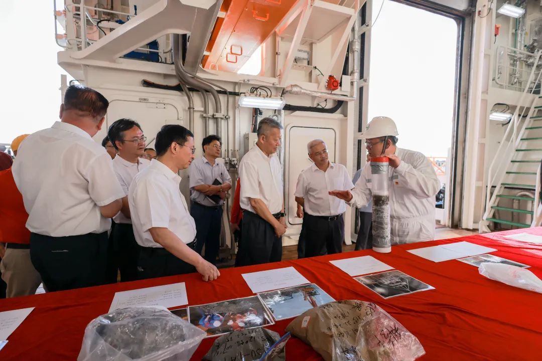 隨后,校領導和三沙市領導一起考察了“中山大學”號海洋綜合科考實習船,調研海上圖書館、海上大講堂、船載科考設備,聽取科研人員有關成果的介紹。