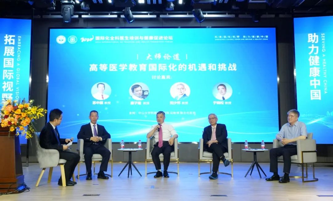 在“大師論道”環(huán)節(jié),美國(guó)凱撒醫(yī)療集團(tuán)系主任唐子略教授,中華醫(yī)學(xué)會(huì)全科醫(yī)學(xué)分會(huì)前任主任委員、中國(guó)醫(yī)科大學(xué)原副校長(zhǎng)于曉松教授,英國(guó)皇家內(nèi)科學(xué)院院士、香港大學(xué)中國(guó)商學(xué)學(xué)院客席副教授劉少懷,中大五院蘇中振副院長(zhǎng)圍繞高等醫(yī)學(xué)教育國(guó)際化面臨的機(jī)遇和挑戰(zhàn)展開(kāi)深入交流討論。