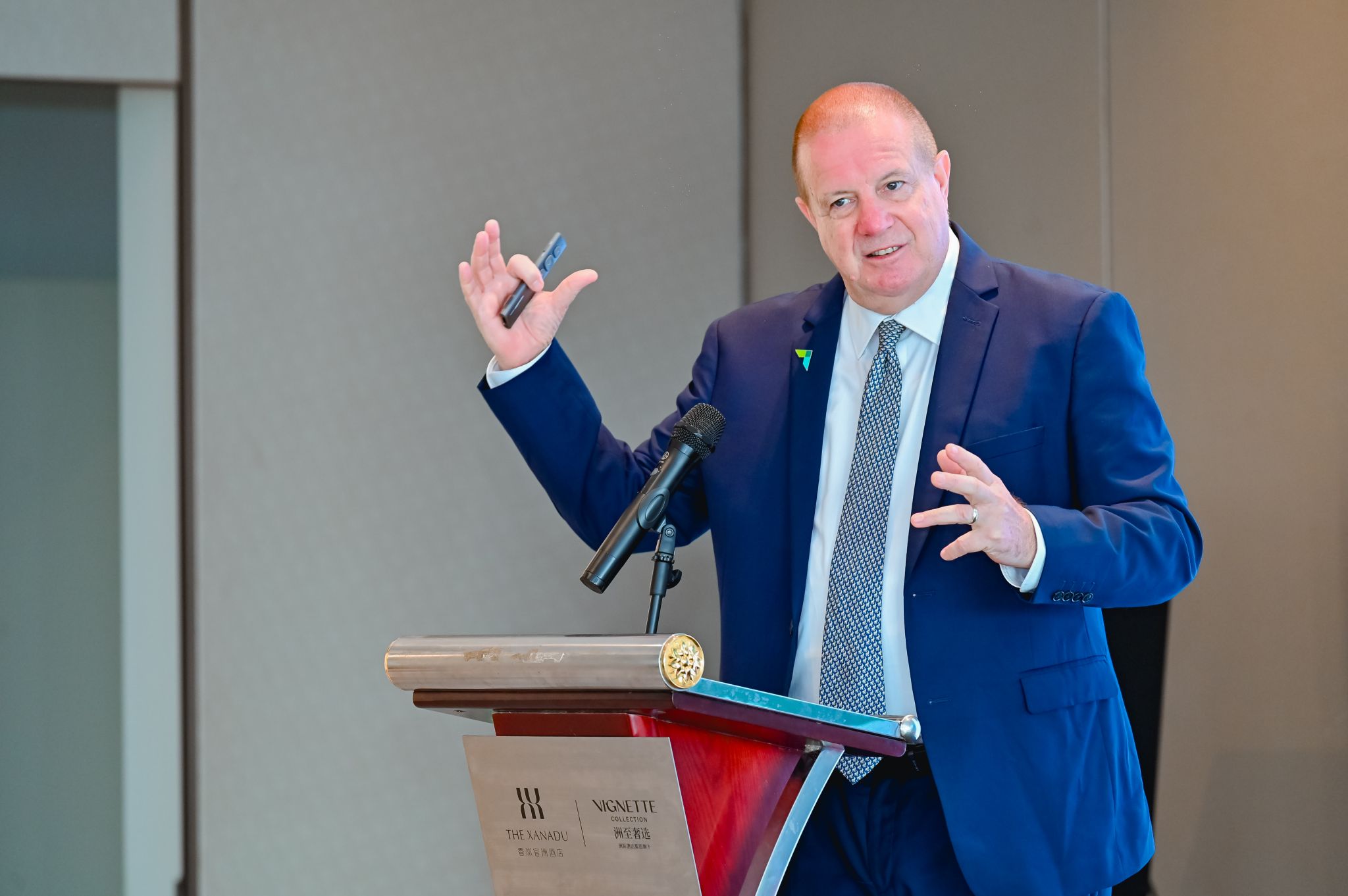 AACSB執(zhí)行副總裁Geoff Perry博士在演講中詳細(xì)介紹了AACSB認(rèn)證標(biāo)準(zhǔn)和未來(lái)商科教育的趨勢(shì),強(qiáng)調(diào)學(xué)科交叉、產(chǎn)教融合、國(guó)際互鑒、代際融通與技術(shù)整合是未來(lái)商科教育發(fā)展的關(guān)鍵方向。他還指出,商學(xué)院應(yīng)通過(guò)使命驅(qū)動(dòng)的戰(zhàn)略引領(lǐng),持續(xù)創(chuàng)新和擴(kuò)大社會(huì)影響力。
