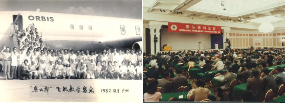 左圖:1982年,奧比斯眼科飛機醫院專家與前來參觀學習的中國眼科醫務人員合影留念