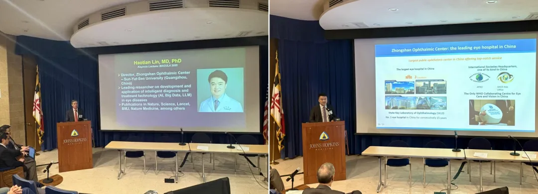 訪問期間,林浩添教授受邀作“AI revolution in retina”主旨演講時表示,新時代人工智能技術是解決當前眼病防治和視覺健康難題的重要突破口,但只有通過全球多中心協作攻關和技術創新,才能真正把握住機遇,才能切實解決人民的眼健康難題。林浩添教授向國際同行展示了中山眼科中心近年來與全球多中心合作,圍繞醫療資源短缺和分布不均等難題,開展眼科人工智能研究并進行應用推廣,為基層和邊遠地區人民提供高質量的眼病診治服務所取得的成效。相關工作受到國際同行高度認可,現場反響熱烈,大家紛紛表示期盼中美眼科雙方優勢互補互融互促,共同為人類的眼健康貢獻力量,中美眼科雙方也初步達成了系列合作意向。2025年5月,中山眼科中心將與Wilmer眼科研究所聯合在ARVO會議舉辦眼病智能防治國際合作的專題研討會。林浩添教授還與在Wilmer眼科研究所學習工作的中山眼科中心校友、中國留學生進行見面交流,歡迎大家共同參與中美眼科的合作交流項目。