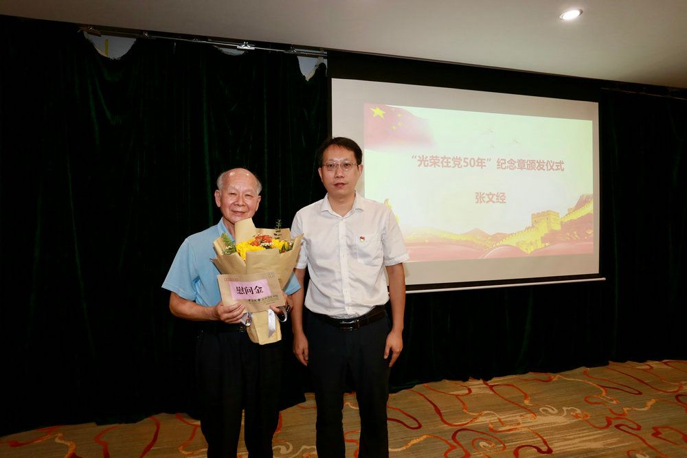 范瑞泉書記首先代表學(xué)院黨委向?qū)W院全體黨員致以節(jié)日的問候。對(duì)獲得“光榮在黨50年”紀(jì)念章的張文經(jīng)副教授表示熱烈的祝賀,并向張文經(jīng)副教授頒發(fā)了“光榮在黨50年”紀(jì)念章。黨委委員、院長夏敏教授向張文經(jīng)副教授送上鮮花和慰問金。頒發(fā)“光榮在黨50年”紀(jì)念章,既體現(xiàn)了黨中央對(duì)老黨員的關(guān)愛關(guān)懷,更是對(duì)一路拼搏奮進(jìn)的老黨員的充分肯定。