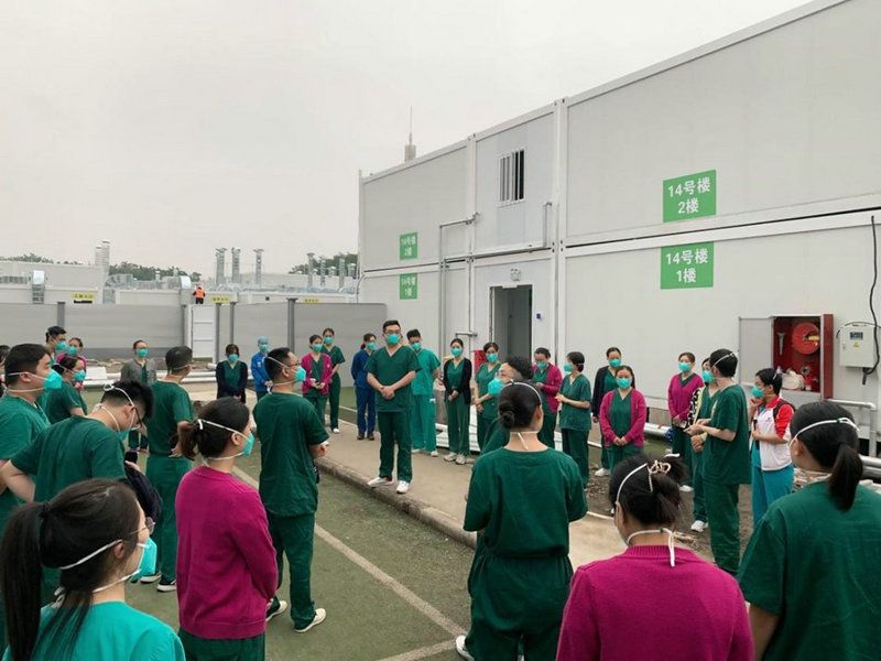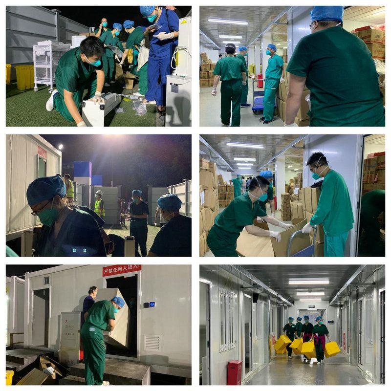 醫(yī)護人員深夜布置方艙醫(yī)院