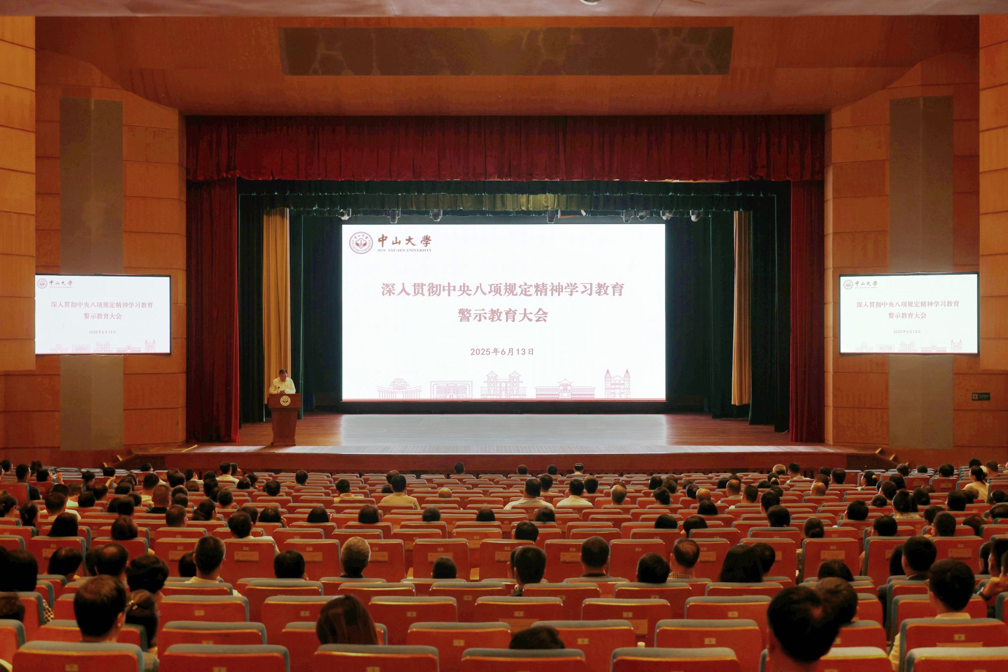 中大新聞網訊(通訊員王敏麗)6月13日,中山大學在南校園梁銶琚堂召開深入貫徹中央八項規定精神學習教育警示教育大會。校領導、全體中層領導人員、新提拔干部、年輕干部、關鍵崗位及重點部門的主管及醫院重點部門的科級干部參加了會議。校黨委副書記、紀委書記、國家監委駐中山大學監察專員刁振強主持大會并作警示教育報告。