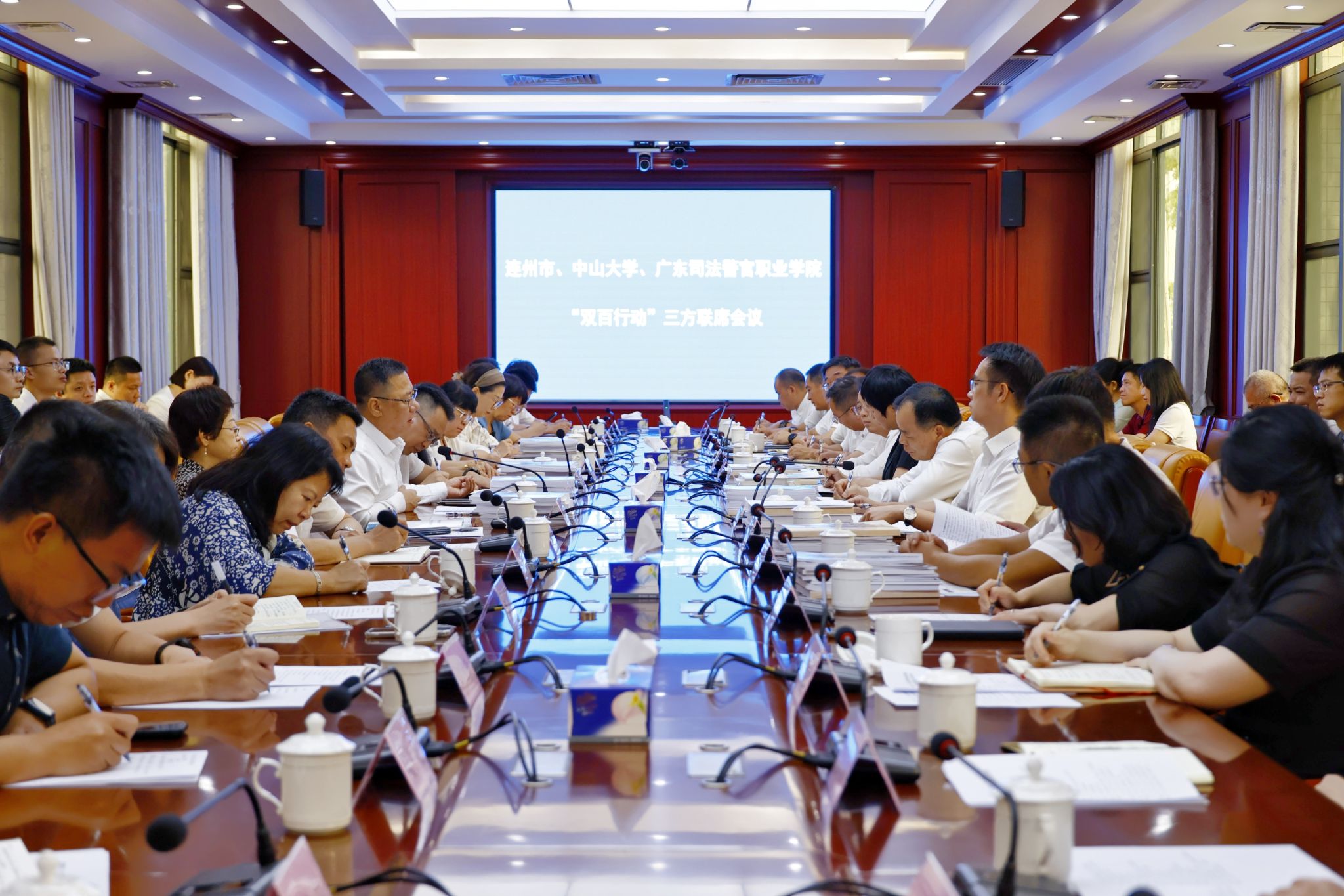 11日下午,中山大學(xué)、廣東司法警官職業(yè)學(xué)院、連州市舉行“雙百行動(dòng)”三方聯(lián)席會(huì)議,總結(jié)了當(dāng)前“雙百行動(dòng)”的整體推進(jìn)情況,并就進(jìn)一步深化合作進(jìn)行交流座談。會(huì)議期間,順利完成了中山大學(xué)“雙百行動(dòng)”駐連州服務(wù)隊(duì)新老隊(duì)員的工作交接,為持續(xù)推進(jìn)校地合作注入新力量。