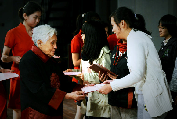 沈祖榮先生之女沈?qū)氭屡繛楂@獎學(xué)生頒獎