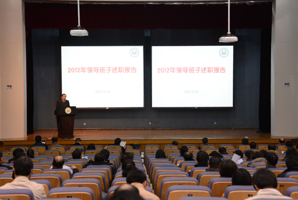12月30日下午,全校2012年度考核述職測評大會在南校區舉行。會議由鄭德濤書記主持,全體校領導、部分單位負責人在會上作年度述職報告。現任校領導、老領導、兩委委員、職能部門和二級單位主要負責人、專任教師代表、民主黨派和無黨派人士代表、教代會代表、離退休老同志代表、學生代表等200余名師生參加了述職測評大會。