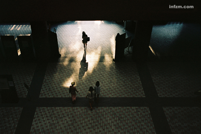 我一眼瞥到了樓下的人,正要走進夕陽里,于是拿出了相機上好了膠卷。我第二眼瞥到她走進了夕陽里,這時我對好了焦。我第三眼看到她的影子被拉長,于是按下快門,光陰就被定格在了那一刻。
