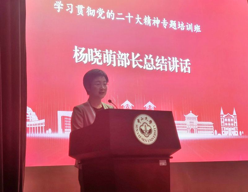 楊曉萌部長在總結(jié)講話中對培訓(xùn)班取得的成效給予了肯定,對學(xué)校各部門和二級黨組織的配合支持、各學(xué)員的積極參與表示衷心的感謝。她對全體學(xué)員提出了三點期望:一是繼續(xù)加強學(xué)習(xí),系統(tǒng)全面準確理解黨的二十大精神,做到常學(xué)常新、常悟常進;二是心懷“國之大者”,牢牢把握中國式現(xiàn)代化的使命任務(wù),為中國式現(xiàn)代化提供堅實人才支撐和智力支撐;三是堅持知行合一,把學(xué)習(xí)黨的二十大精神與貫徹落實學(xué)校第十四次黨代會精神結(jié)合起來,聚力推動學(xué)校高質(zhì)量內(nèi)涵式發(fā)展。她強調(diào),站在迎接百年校慶的歷史交匯點,我們要以更加昂揚的姿態(tài)、飽滿的精神、實干的行動,加快中國特色世界一流大學(xué)建設(shè),主動以高質(zhì)量內(nèi)涵式發(fā)展融入中國式現(xiàn)代化偉大進程,譜寫中大新篇章。