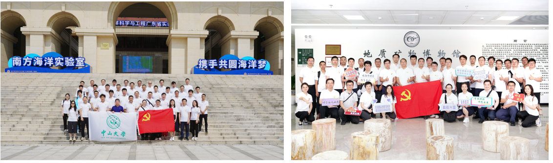參觀合影(左圖在海琴四號樓前,右圖在地質礦物博物館中)