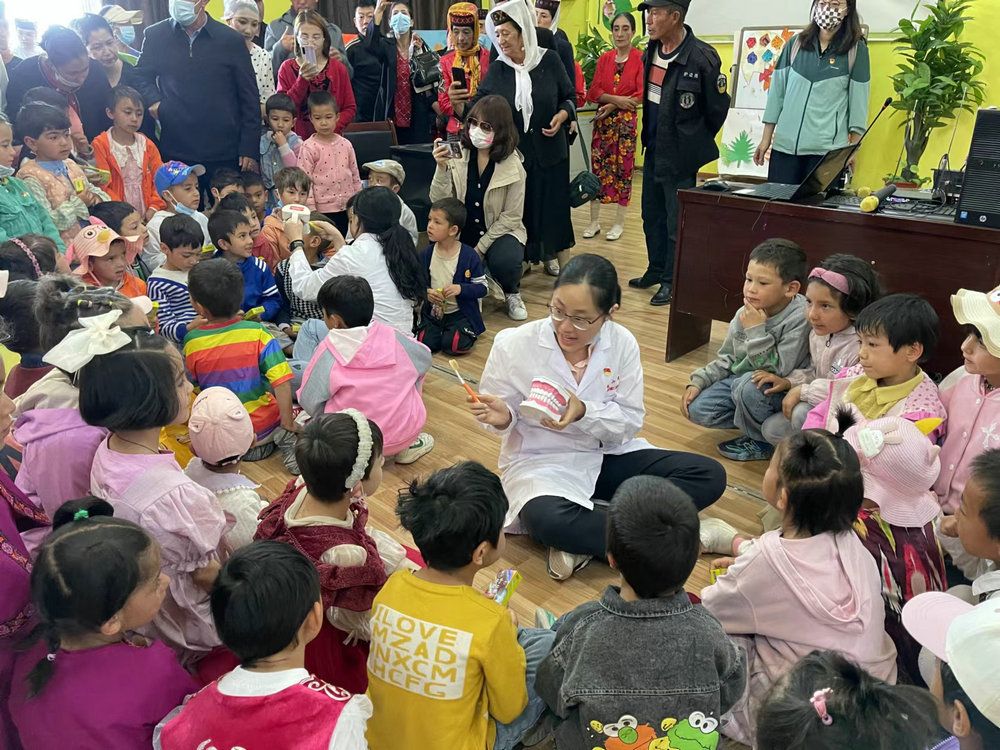 服務隊為塔什庫爾干縣中心幼兒園的小朋友們開展口腔健康宣教、涂氟防齲等服務