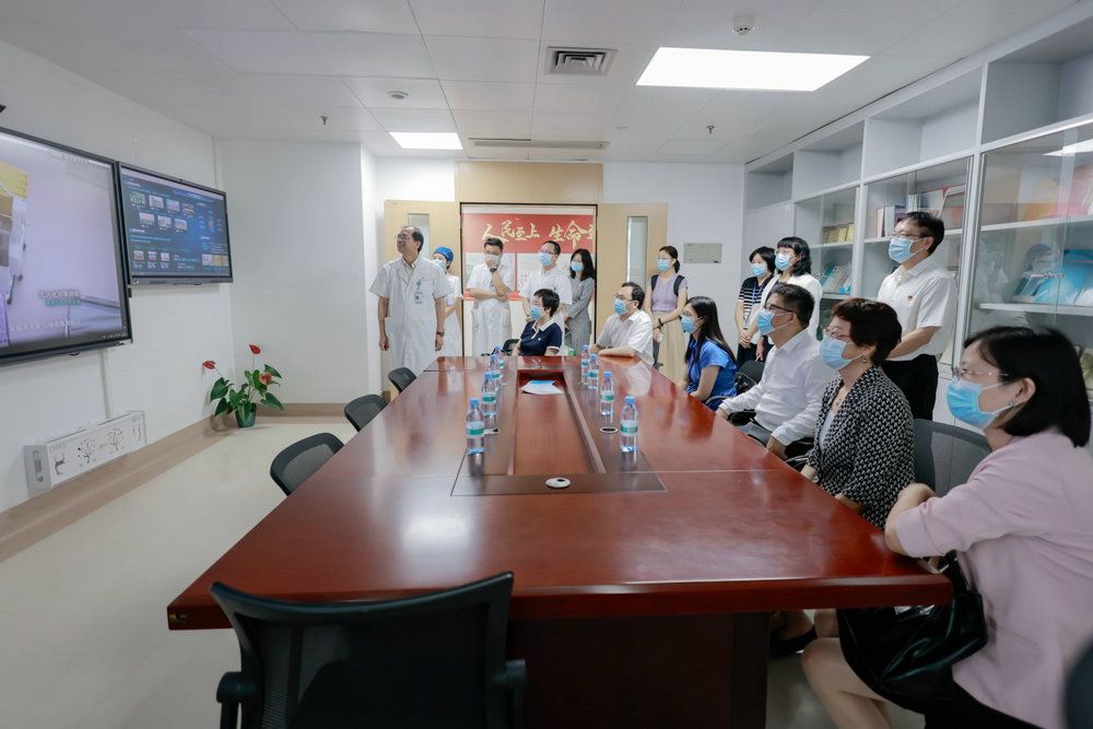 此外,指導組一行現場考察了附屬第三醫院脊柱外科和感染性疾病科病區,近距離查看智慧醫院普通病房和負壓重癥病房建設情況,就智慧化診療給患者帶來的“服務升級”體驗與一線醫務工作者深入交流。附屬第三醫院楊欽泰副院長現場演示智慧管理、智慧醫療、智慧教學、智慧科研的實際應用場景,任杰副院長遠程為一位遠在粵東的甲狀腺疾病患者進行超聲檢查,加深了指導組專家對智慧醫院應用的認識。