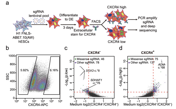 m6A(N6-methyladenosine)RNA修飾是發生在RNA腺嘌呤上含量豐富的可逆的動態修飾。王金凱教授在美國博士后期間的工作發現m6A在胚胎干細胞命運決定中發揮關鍵的作用,缺失m6A的胚胎干細胞會導致干性基因不能正常降解從而喪失分化潛能。然而由于目前并沒有方法能夠對m6A位點進行轉錄組范圍的功能篩選,因此難以系統揭示具體哪些m6A位點在胚胎干細胞細胞命運決定中發揮關鍵的作用。腺嘌呤單堿基編輯器可以直接在DNA上修改m6A修飾位點的腺嘌呤堿基,從而導致相應RNA上m6A修飾被破壞。基于這一策略,研究團隊設計了由7999條sgRNA組成的文庫,這些sgRNA可以靶向6048個不同的m6A 位點所對應的DNA。為了篩選在胚胎干細胞向內胚層分化中發揮作用的m6A位點(sgRNAs),研究團隊在人胚胎干細胞(hESCs)中通過慢病毒轉入sgRNA文庫后,誘導hESCs向內胚層分化,以CXCR4為標記通過流式細胞分選強陽性(內胚層)和陰性(非內胚層)的細胞,通過比較不同sgRNA在兩群細胞中的富集程度從而篩選出78條在非內胚層中富集的sgRNA和137條在內胚層細胞中富集的sgRNA。研究團隊選擇了分別位于SOX2和SDHAF1基因的兩個促進分化的m6A位點和一個位于ADM基因的抑制分化的m6A位點進行了功能驗證,發現這三個m6A確實是通過m6A的機制影響胚胎干細胞向內胚層分化。