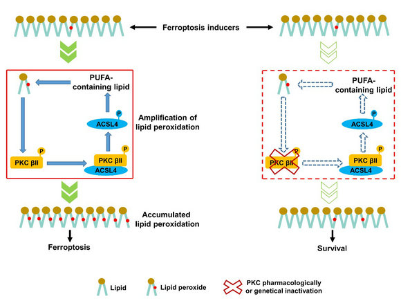 圖:PKCβII-ACSL4正反饋軸啟動脂質過氧化的擴增過程誘導鐵死亡發生