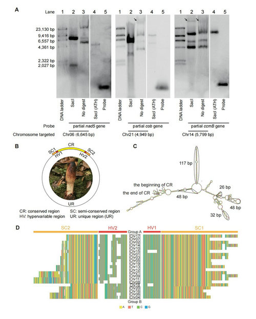 本研究發現,與大多數植物的線粒體基因組不同,盾片蛇菰的線粒體基因組由21個小型的(4-8 kb)環狀染色體組成,總長僅有130,713 bp,是迄今為止被子植物中線粒體基因組第二小的案例。其線粒體基因的每個順式剪切的內含子也是所有已報道種子植物和蕨類植物中最短的。課題組進一步利用Southern blot實驗驗證了本物種線粒體染色體的環形結構,明確確定其復制方式為滾環復制(rolling circle replication),并首次在植物中鑒定到線粒體DNA的復制起點——一段117 bp的回文序列(圖1)。本物種的每個線粒體染色體都可以劃分為四個區域(圖1),即由所有染色體共享的保守區(conserved region,CR),CR兩側的由串聯重復序列組成的高變區(hypervariable region,HV)和與HV相鄰的部分染色體之間共享的半保守區(semi-conserved region,SC),以及包含了所有基因的各個染色體的特有區(unique region,UR)。其中HV在同一染色體的不同拷貝間也會有很大的差異。有趣的是,這些結構和特征與部分寄生動物的線粒體基因組和少數自養原生生物的質體基因組表現出相似性,表明部分植物和動物中細胞器基因組結構的趨同進化。