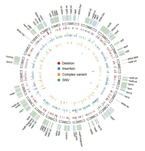 盾片蛇菰的線粒體DNA在個體內擁有極高的異質性(heteroplasmy),主要表現為UR中豐富的的插入(insertion)、缺失(deletion)、復雜變異(complex variant)和HV中的拷貝數變異。在21個染色體的URs中一共檢測到777處異質性變異(圖2),包括蛋白編碼區的167處。奇怪的是,蛋白編碼區的變異絕大多數都會造成非三基數的移碼突變,出現提前終止密碼子。以atp4基因(含有3處異質性變異)為例,100個隨機克隆測序檢測到了所有的8(23)種變異體,其中可翻譯為全長蛋白的克隆數僅有21個。基于RNA-seq數據分析表明:所有的異質性變異都被無差別轉錄,且其頻率與在DNA-seq中檢測到的頻率相當。然而,本物種的CR和質體基因組中均無異質性,這側面證實了CR的重要功能(包含復制起點)和該物種中線粒體基因組的獨特特征。另外,本研究未能檢測到在線粒體基因組中行使DNA復制、重組和修復的基因中的兩個基因(WHY2和OSB2/3/4)的表達,這可能是造成盾片蛇菰線粒體DNA極高異質性的原因。